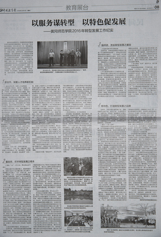 本网讯   12月13日,《中国教育报》第8版教育展台以题为《以服务谋转型   以特色促发展》深入报道我校不断探索应用型高校发展路径。文章从“抓合作,探索人才培养新机制”、“重服务,抓牢转型发展之根本”、“强师资,夯实转型发展之基础”、“炼特色,打造转型发展之品牌”四个层面报道我校多措并举,扎实推进转型发展试点工作,态势良好,成效显著。