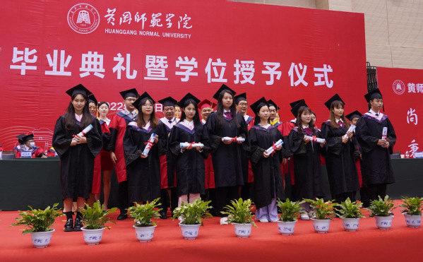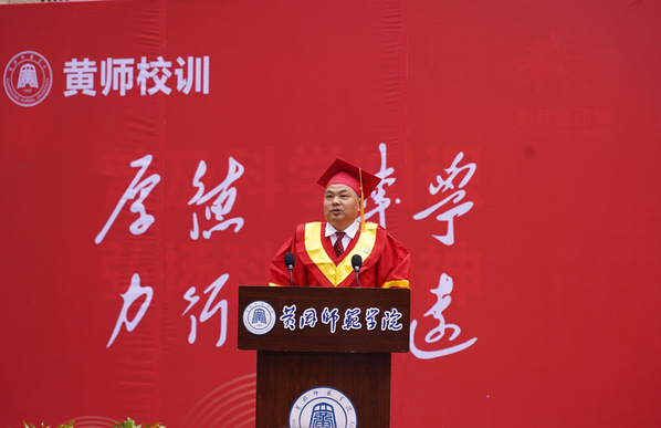 校学位评定委员会主席、校长陈向军发表讲话。他指出,这一届的毕业生与大时代同行,参与、见证了学校的快速发展,是黄师历史上非常特别、也非常优秀的一届毕业生。他希望毕业生们能传承“尚师表、勇担当、秉诚朴、图自强”的黄师精神,坚守初心、坚定信心,坚持恒心,勇敢地面向未来,用青春创造美好明天。希望同学们坚守初心,心怀国之大者。向英雄学习、向前辈学习、向榜样学习,以国家的发展轨迹定义个人的成长坐标,把个人理想融入民族复兴伟大理想,不负韶华,不负时代,不负人民,在青春的赛道上奋力奔跑,跑出当代青年的最好成绩,真正成为祖国建设的奋进者、开拓者、奉献者。希望同学们坚定信心,担当复兴大任。更加自信、自立、自强,相信自己一定能行,不断增强做中国人的志气、骨气、底气,以朝气蓬勃的青春之姿,展现新时代青年的使命和担当,在实现中华民族伟大复兴的时代洪流中踪厉奋发、勇毅前进。希望同学们坚持恒心,争做事业闯将。无论做什么事,都要懂得坚持,面对强大的对手,要善于“结硬寨、打呆仗”,做踏踏实实走好每一步的长期主义者,敢于当“笨小孩”, 一步一个脚印地朝着梦想的方向前进。几年黄师学子,一生黄师情缘,他希望同学们永远保持自信模样,朝着星辰大海,对答世界!