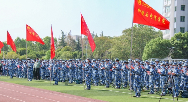漆昌柱在大会上讲话并作军训动员,他对新生的到来表示热烈的欢迎,希望新生以“四心”启航新征程 用奋斗担当新使命:一要保持爱国心,胸怀国之大者。希望同学们向优秀校友学习,以优秀老师为榜样,始终心怀“国之大者”,把自己的小我融入祖国的大我、人民的大我之中,不畏困难,追求卓越,争创一流,努力成为“对国之大者心中有数”的坚定践行者。二要保持好奇心,勤奋刻苦学习。希望同学们珍惜大学学习时光,心无旁骛求知问学,沉下心来,多读经典,沿着求真理、悟道理、明事理的方向前进,占领知识本领的高峰,去赢得主动、赢得优势、赢得未来。三要保持上进心,勇担复兴大任。希望同学们始终保持上进心,每天努力一点点,每天进步一点点,通过完成一个个小目标,积少成多,最终实现人生大目标,以实际行动担当民族复兴大任。四要保持持久心,书写精彩人生。无论做什么事,都要懂得坚持,做踏踏实实走好每一步的有志者,一步一个脚印地朝着梦想的方向前进。最后,他希望同学们始终谨记“厚德、博学、力行、致远”的校训,以“四心”启航新征程,用奋斗担当新使命。勤奋学习、砥砺奋进,努力成为堪当民族复兴重任的时代新人,奋力书写属于自己的青春华章。